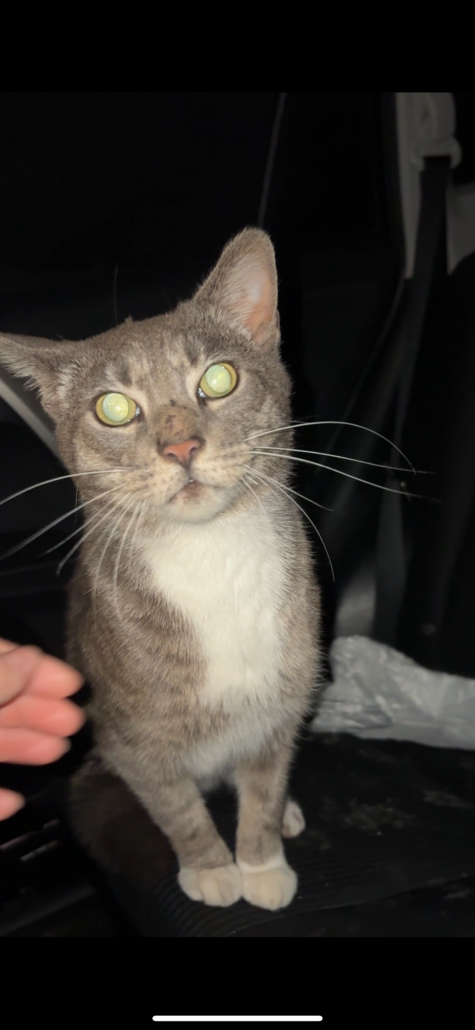 This is a medium sized cat. Seemed to be a younger cat. Orangish Gray color with stripes but also dots/leopard print fur. White paws and chest. Really scared, but was willing to walk up to me and allow me to carry it. Wasn’t able to check for Sex. Was really friendly, although terrified. Was found crying in the middle of the road.