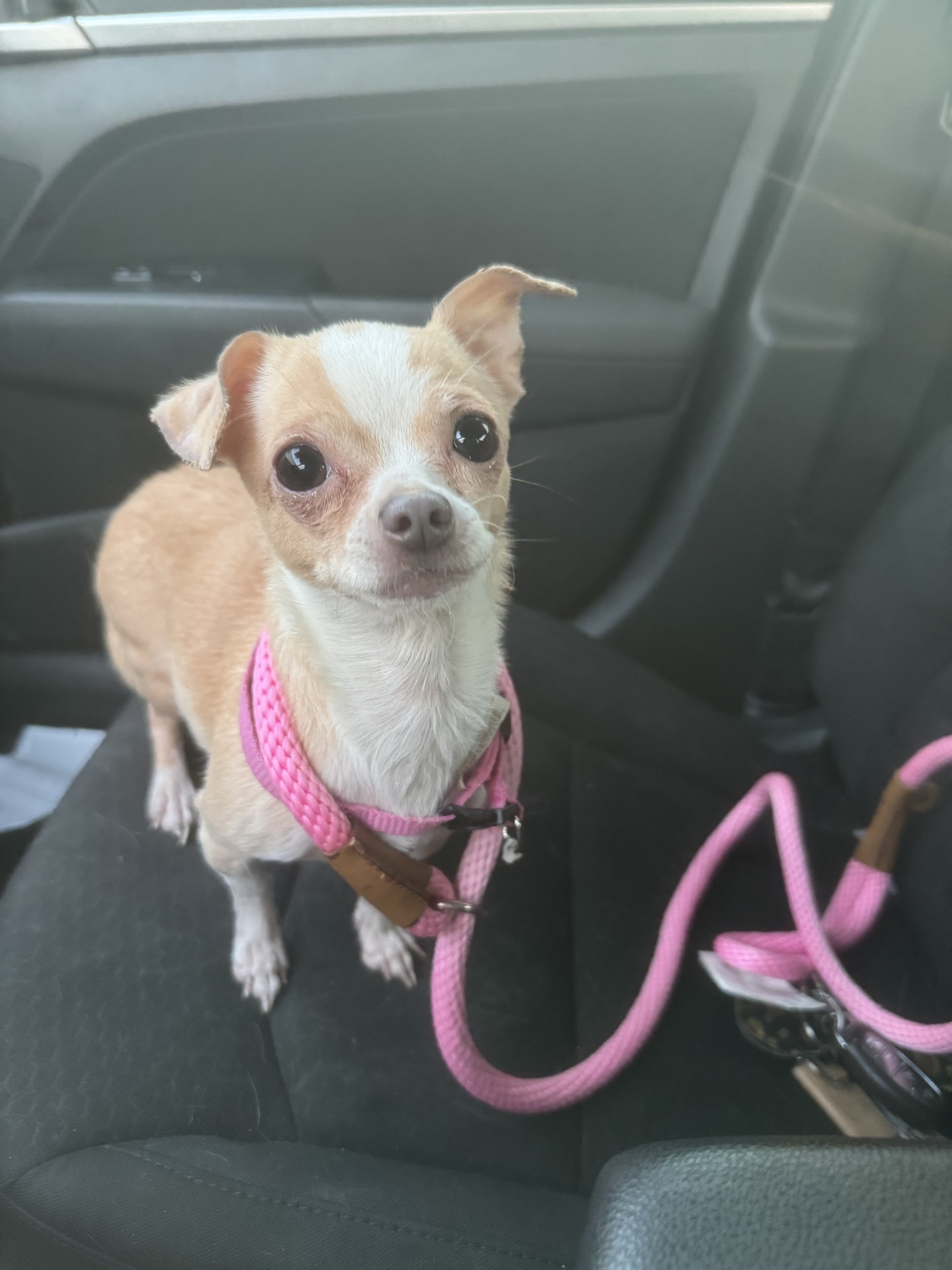Tan and white Chihuahua mix, pink collar, no tags and no microchip.