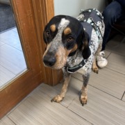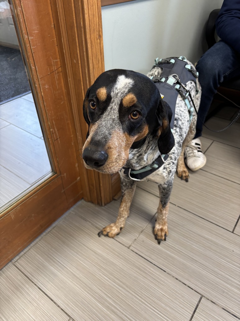 Male Hound Mix. Not neutered. Found with harness and leash attached