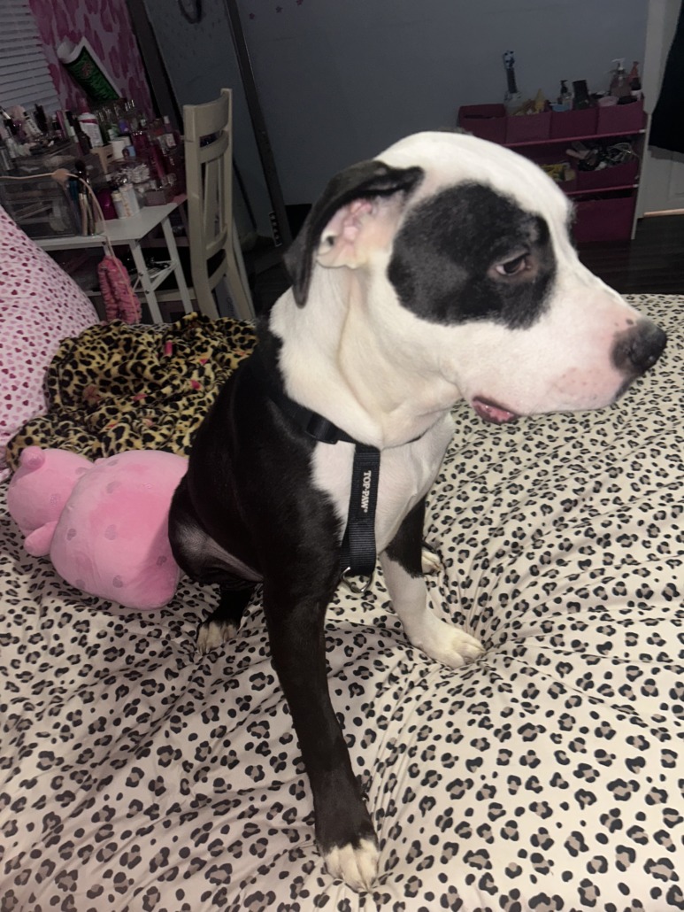 black and white medium dog, possibly mixed with pit. was chipped but the chip wasn’t registered? found in southern plaza.
