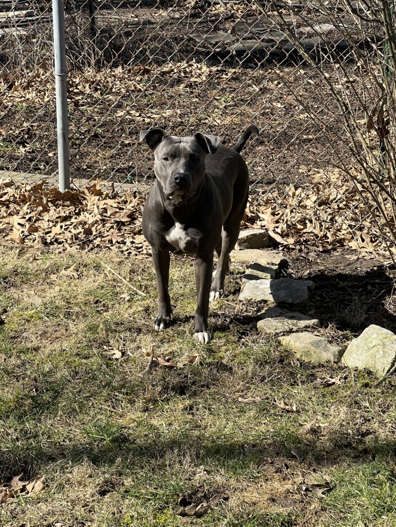 No collar – gray pit – female – looks to have had pups. Playful, very friendly & sweet.