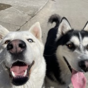 Found two huskies wandering Eagle Cove neighborhood; one male (black/white) and one female (white). No collars or id. Appear in good health, cared for, groomed, friendly. They are not known to be from this neighborhood.