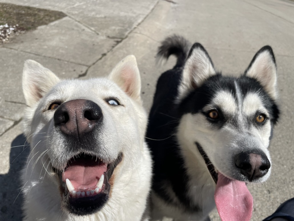 Found two huskies wandering Eagle Cove neighborhood; one male (black/white) and one female (white). No collars or id. Appear in good health, cared for, groomed, friendly. They are not known to be from this neighborhood.