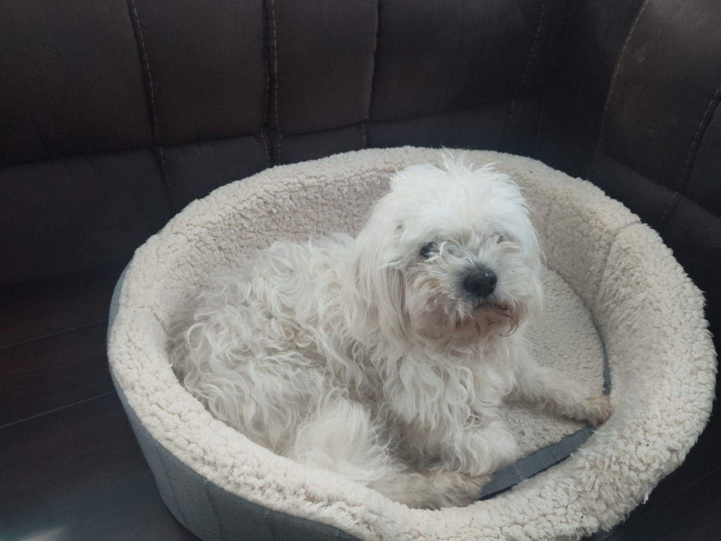 Vocho is a white dog with a black nose. He has a white spot on his nose. He has a long tail that curls onto his back and he is 17 years old.