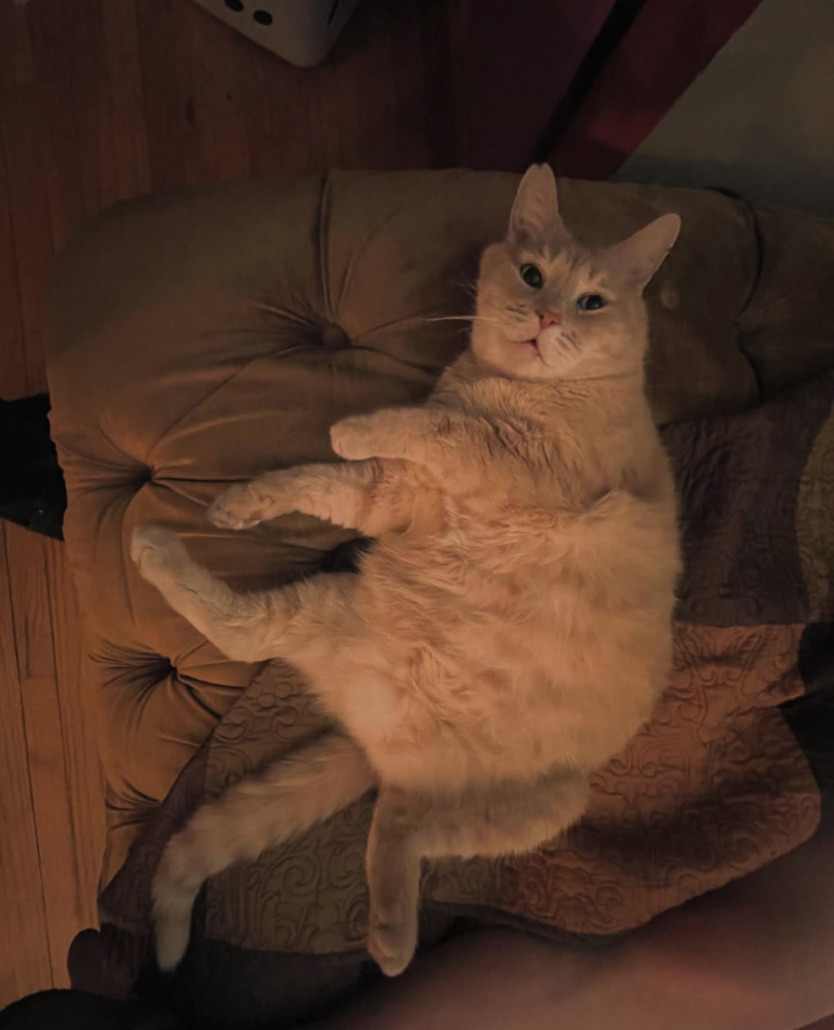 Tan, 18 pounds, listens to his name, has a scar on one ear tip,