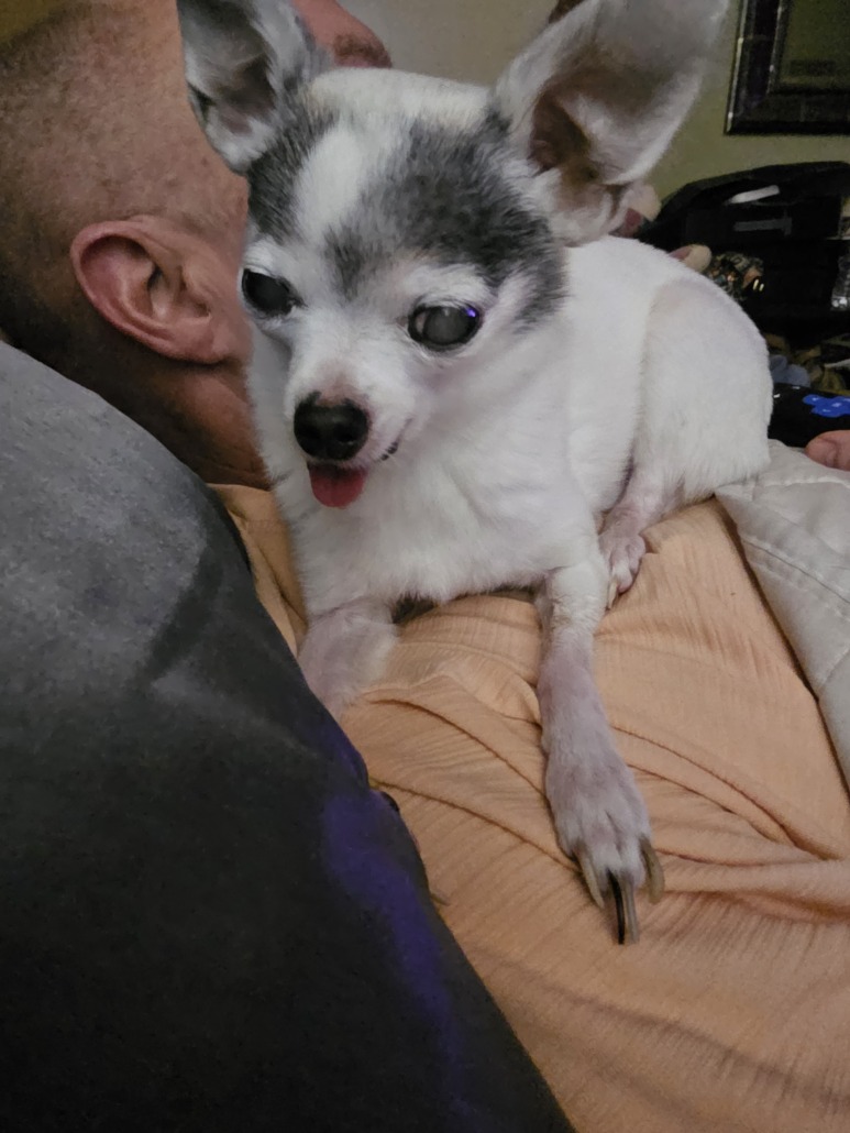 Vinny is only 3 lbs. He is an older little guy. He is timied because he is losing his eye sight. He is mostly white with some black spots.