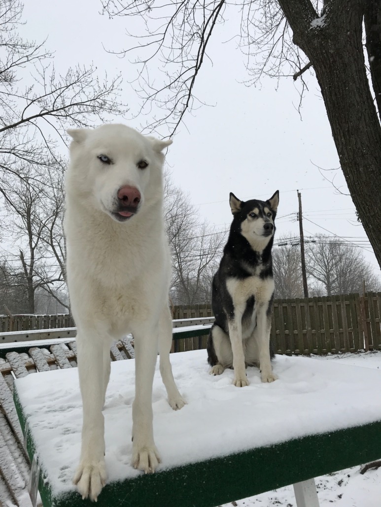 Lance is a white Husky. He’s travels g with his brother, BJ, who is a black and white Husky. Both got out of their fenced yard after the storm brought a tree down in the fence.