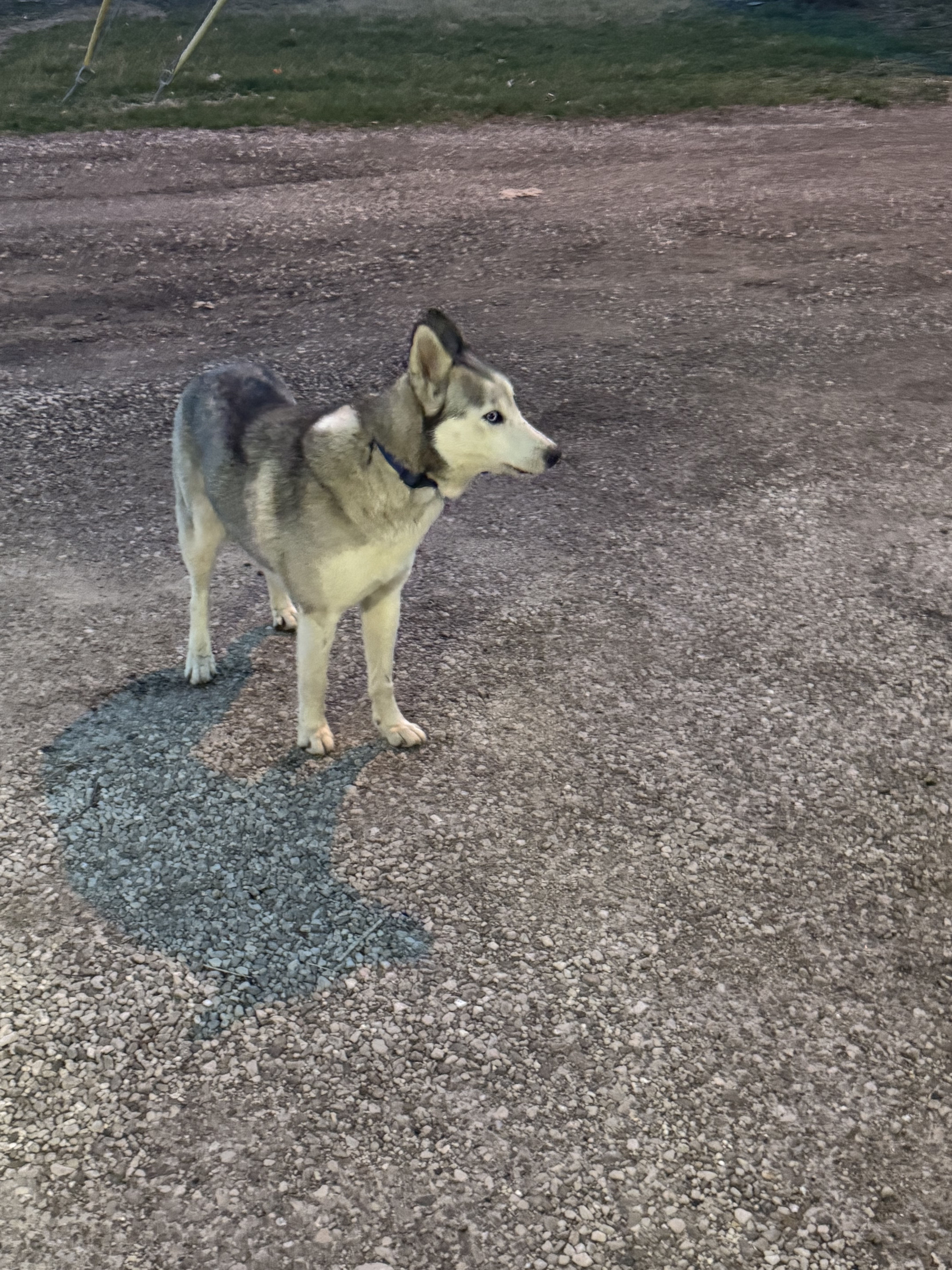 Husky appears to be a female wouldn’t come up to be checked for a tag but was just hanging out around the house.
