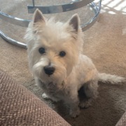 She is white and currently has much longer hair than on the picture. She had light green/tiffany color collar and leash.