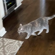 Ruby is a domestic short hair grey cat. She may come to a calm person when called.
