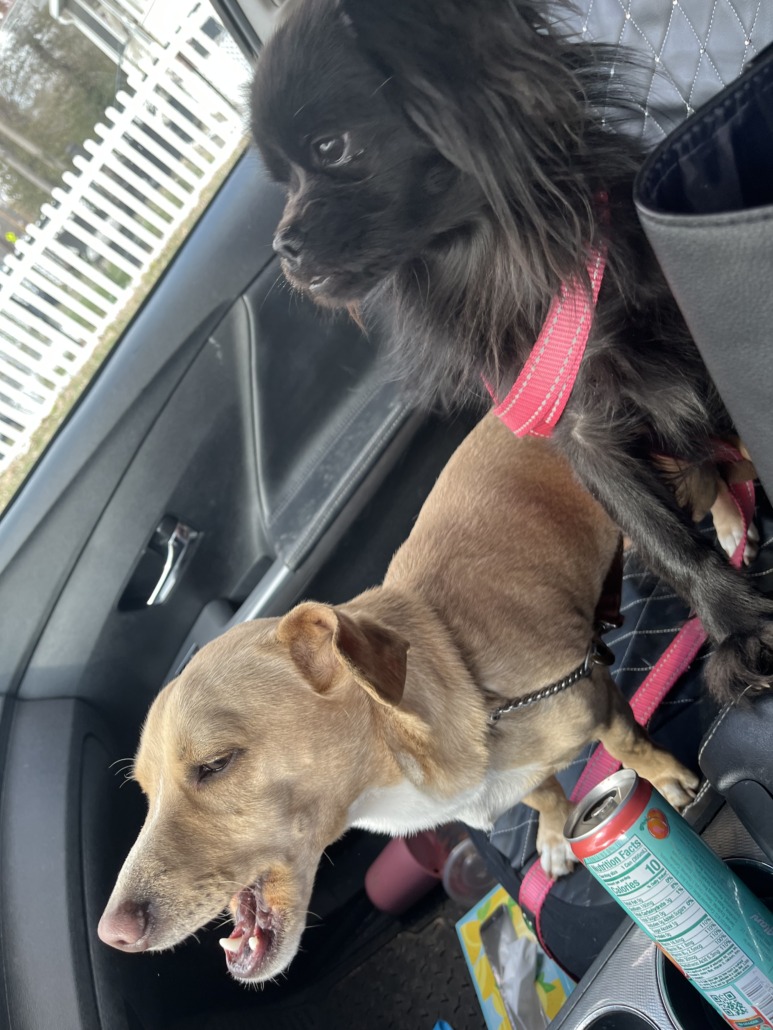 One black little dog long hair. One short hair tan little dog. Both males.