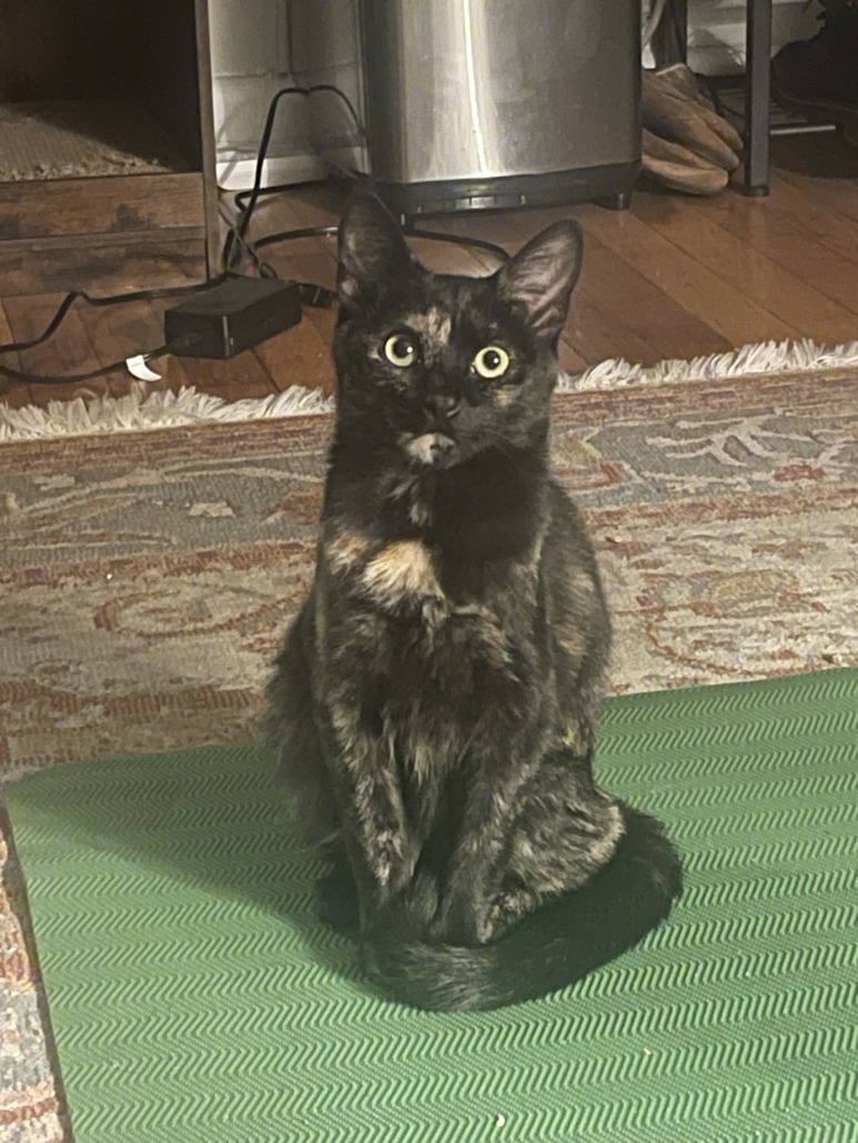 6 month old tortoise shell kitten, around 5-7 lbs. her name is Beatrix.