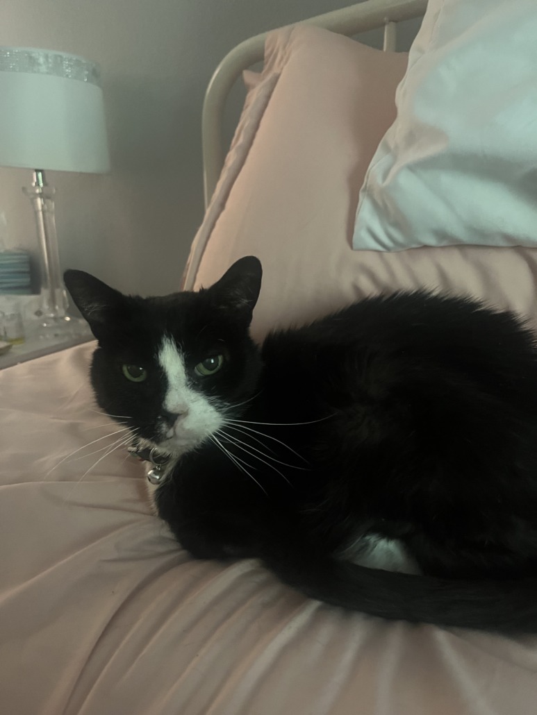 He is a black & white tuxedo cat, on the smaller side, about 6/7 years old
