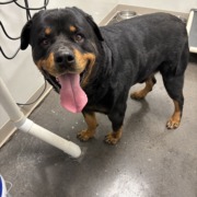 Big Rottweiler, very well mannered boy, not neutered. Knows how to sit and give you his paw. Was not a fan of the car but hopped right in for warmth. No chip found at the vet.