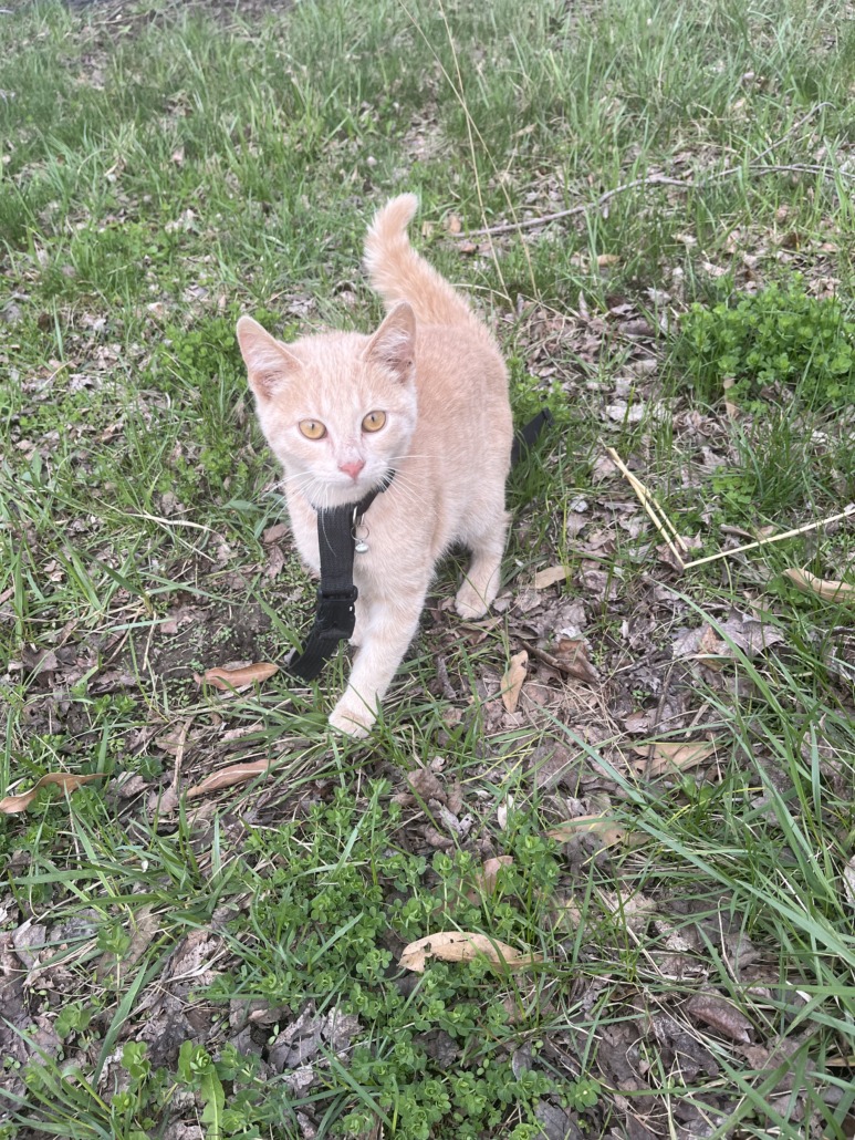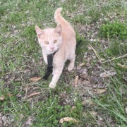 Found small cat/kitten near the White Castle Corporate Office parking lot in Fountain Square. She has a collar attached to part of a leash with a small bell. Very sweet. Light orange/beige color.