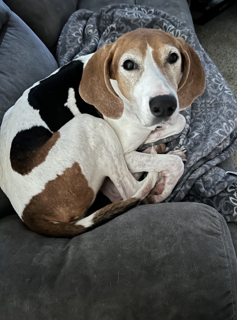 Senior hound dog. Tri colored – mostly white with orange and black markings. Pink and black collar with no tag. Has a sore on her back left hip. Lots of white and grey hair around her face.