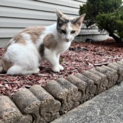 Very small, possibly less than a year old. Calico, mostly white with some orange and brown spots on back. Tail is fully orange and brown. Seems sweet and talkative but very skittish.