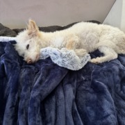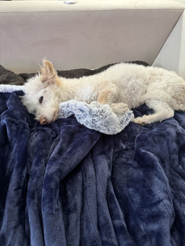 Female. 12 pounds. Poodle/terrier mix. White with brown spots. 14 years old.