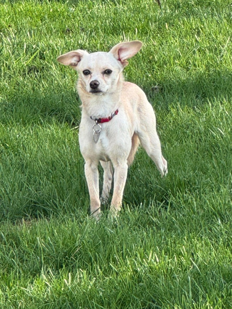 Tan white little chihuahua, red collar with tag from FACE, girl, seemed to be in heat
