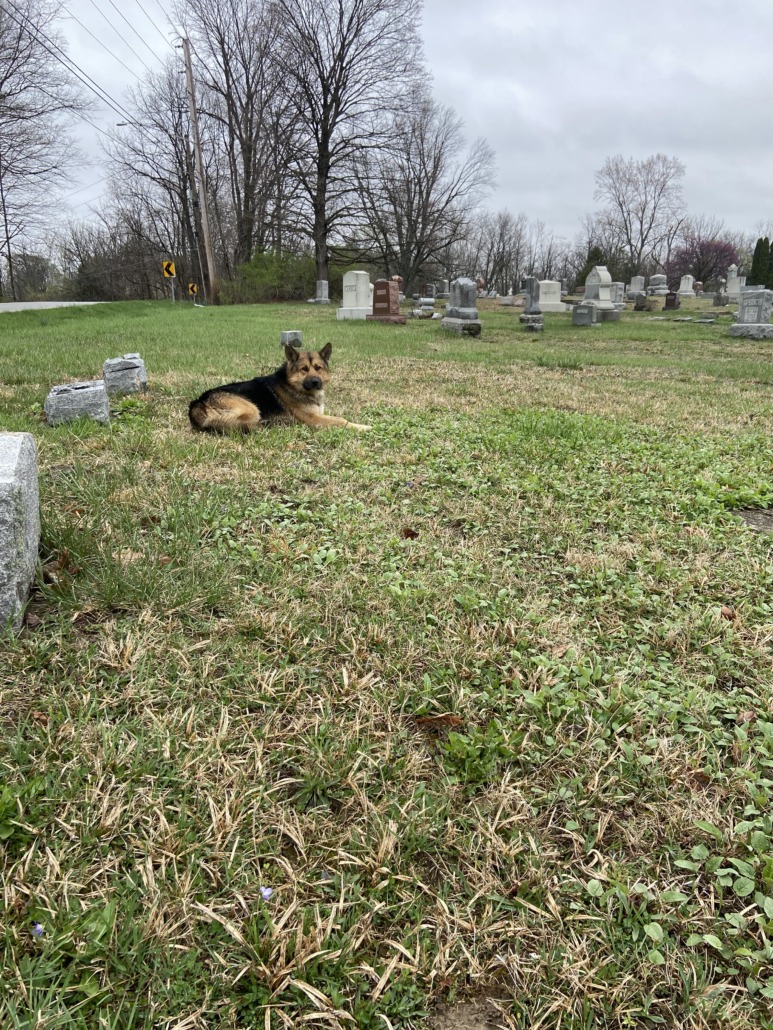 Medium size German Shephard going south on Oaklandon towards water tower.