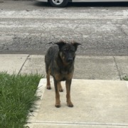 Dog was seen yesterday 4/5, running down Parker with a white pitbull. Today it showed up alone in the front yard of house I am staying in. Appears young, a bit skiddish but came to the sidewalk & ate kibble