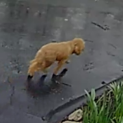 curry brown dog, maybe 30 lbs, some sort of collar or neckerchief around neck. Headed down Kinlock Drive headed into