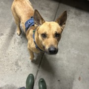 Very sweet boy, tannish red with a darker snout. Wearing a blue harness with a Vetco rabies tag. No microchip. Called Vetco and they left a voicemail with the owners and identified the dog as Slinky.