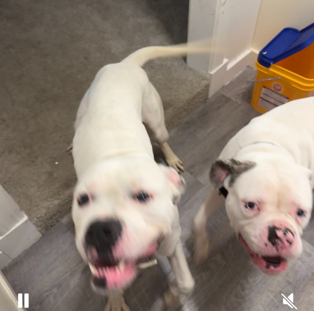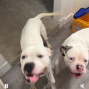 Two mostly white males dogs medium build. Freddie has brown spot over ear and blue eyes. Krueger mostly white with deep black spots on body seen through fur.