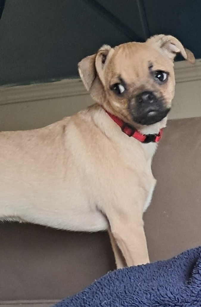 Very small, very lovable tan dog. Has a red collar on. Answers to the name Quinn