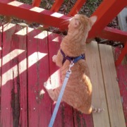 Orange boy with sweet face, tabby striping, M on his forehead, rings on his tail, has one or two black tipped whiskers