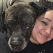 He’s wearing the same sweater that is in his picture. He’s a large cane corso, brindle, with a sweater and a bandana on. He’s got some slight graying around his muzzle.