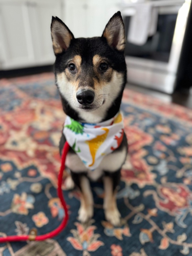 Black and tan Shiba Inu, about 20 lbs. very friendly and will let you pick him up.