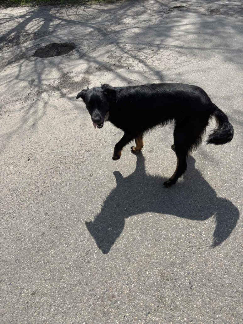 Primarily black dog but had tri-colored fur on chest, stomach, and legs. The coloring looked like a Bernese Mountain Dog but the dog itself did not resemble a Bernie. Some longer, somewhat wirey fur. Was with a white cream Lab/Lab mix that were definitely together/live together. Dog was a little anxious but also more high-energy and adventurous. It was walking around checking things out while the Lab was checking me out. The dog would come close when the Lab did to try to let me pet it, too. But the Lab was a bit more comfortable and directly friendly. Had ran across the street to get to this location where I got out and checked them out.