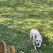 I believe she’s a female white dog with spots hanging out around 48th and Allisonville Road. She is wearing a purple collar. Too nervous to come to us