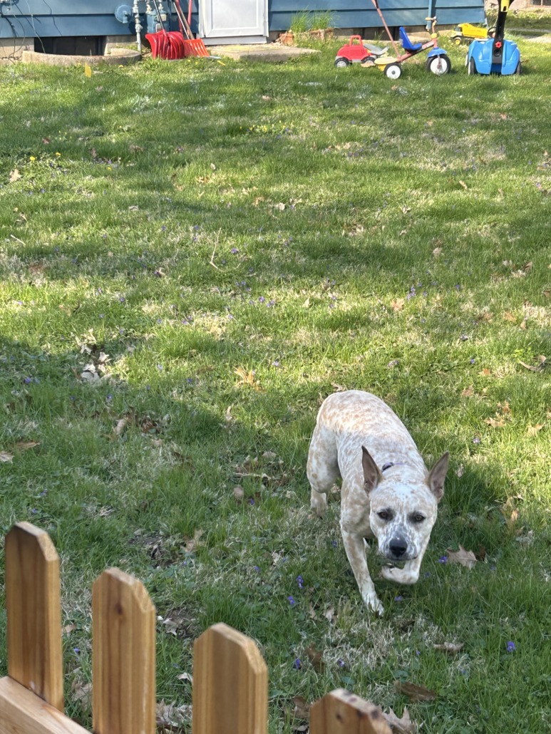 I believe she’s a female white dog with spots hanging out around 48th and Allisonville Road. She is wearing a purple collar. Too nervous to come to us