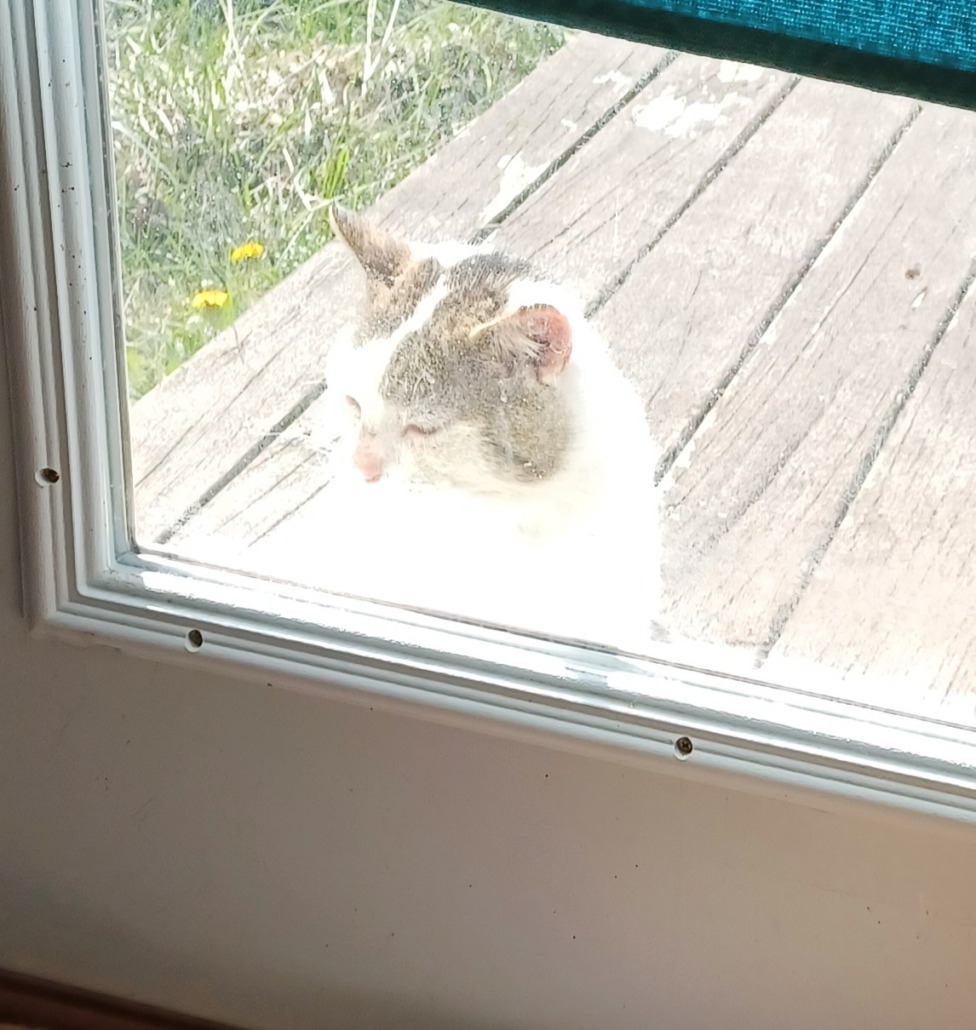 Cat is majority white, however has a tabby striped tail and face markings. Pink nose.