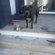 Female pit found with male, appears well fed, friendly, black/grey coloring, and young