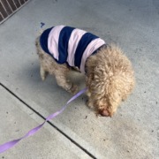 Doodle mix. Matted. Blue and pink shirt. Colorful color.