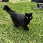 black cat with white spot in the middle of chest, long hair. proof of ownership required