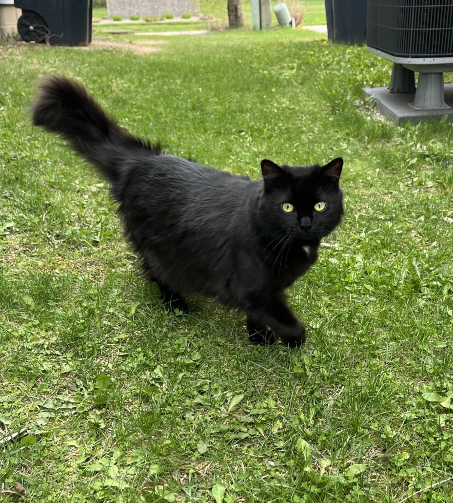 black cat with white spot in the middle of chest, long hair. proof of ownership required