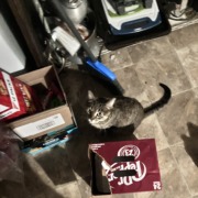 Her name is Maggie she is 1 years old she is a grey tabby cat