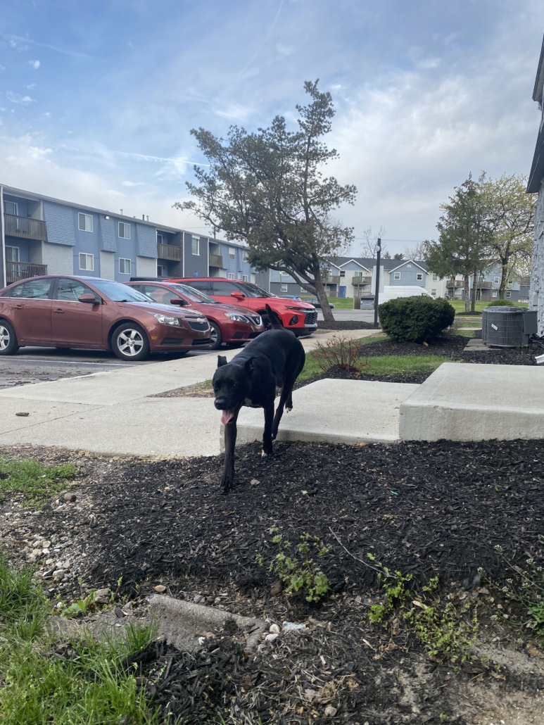 Medium black dog, female. Black with white chest/belly and toes. Appears to be a lab mix, but I can’t say for sure. Very sweet and friendly