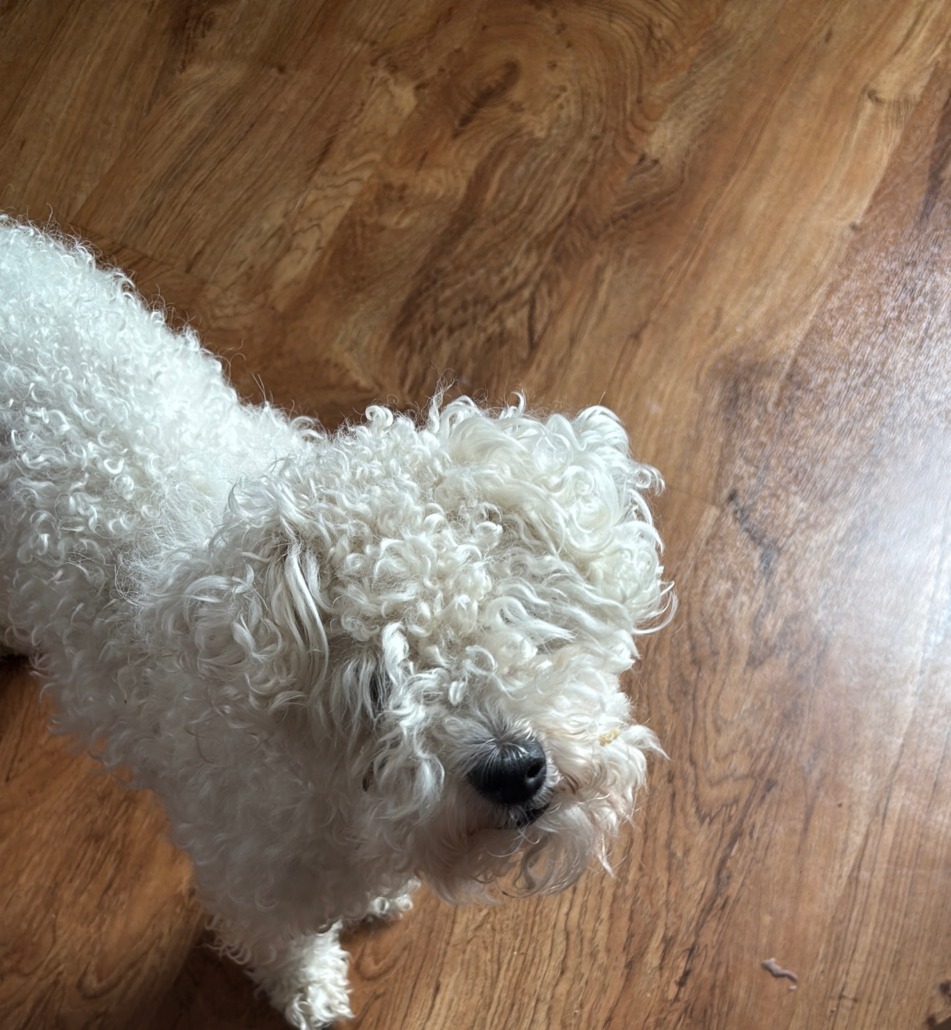 He is a white poddle mix. He is somewhat timid will bark if you try to grab him.