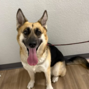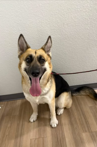 She is a female German Shepherd, presumbly still a puppy. She has a tan coat with black saddle and black fur around her nose and snout of her face. Proof of ownership is required.