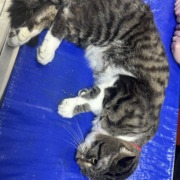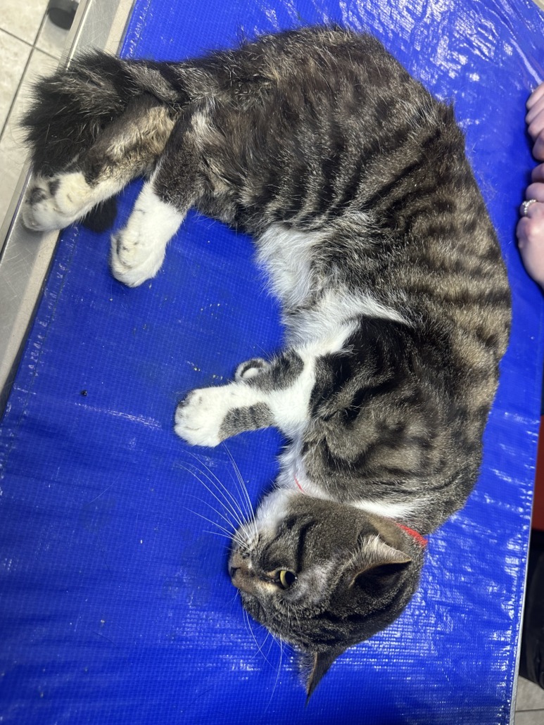 Intact male: Gray Tiger with white underneath. Has fractured leg and is being held at Noah’s 24 care on stop 11.