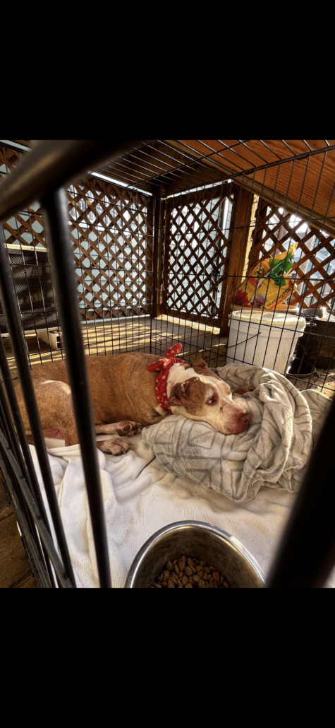 Senior female possible pit bull/pit bull mix, wearing a red bow/scrunchie