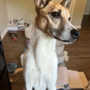 Roger is a brown and white basenji. He’s very friendly and will come when called. He has seizures and requires medication.