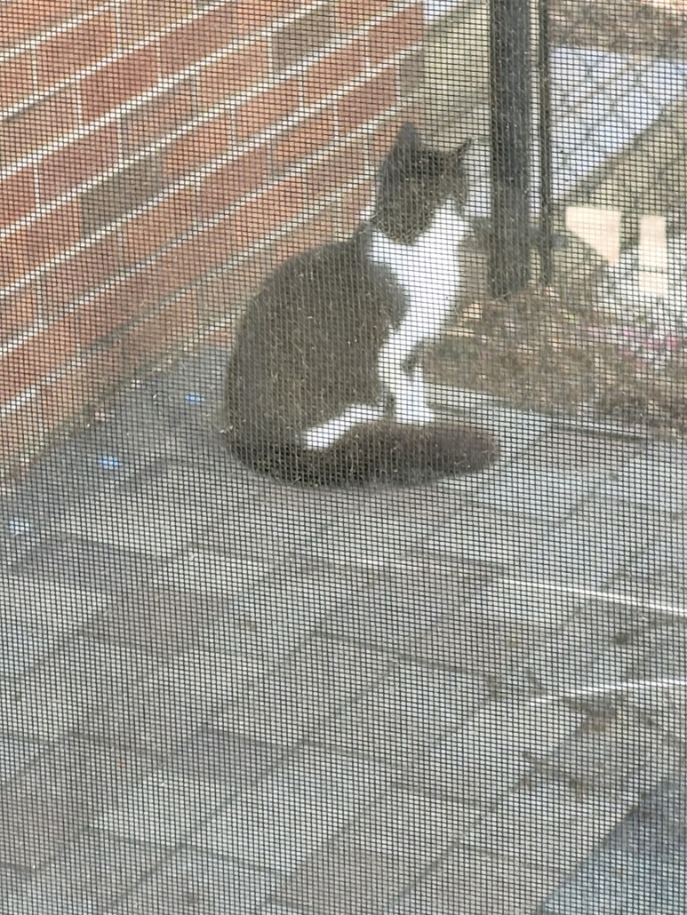 Young looking black and white cat…fluffy rail. Would not come to me but came close and laid down and rolled around meowing. Ran off when I tried to go closer.