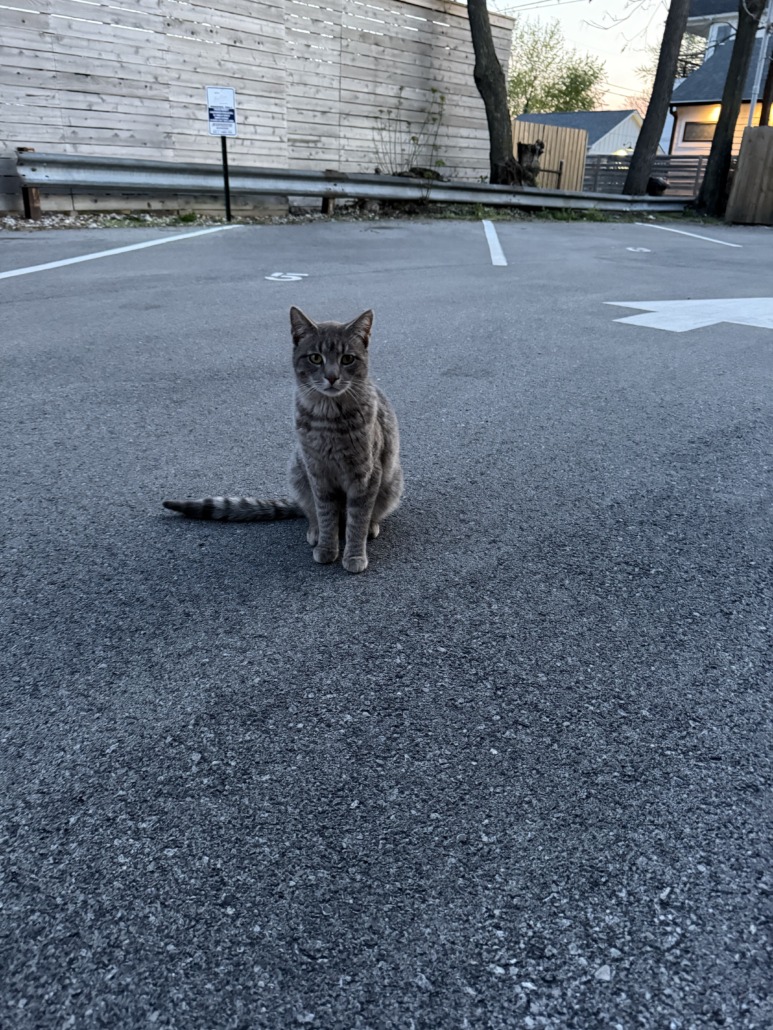 Small grey cat. Friendly walks up to people but doesn’t touch. By burger joint and bar.