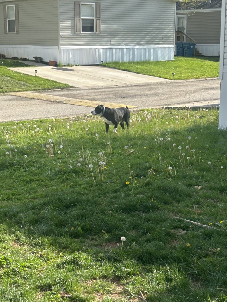Black with white male dog looks like a pit teal or light blue collar. Seems friendly but didn’t really want to approach us so we didn’t force him. He seems okay just wandering around